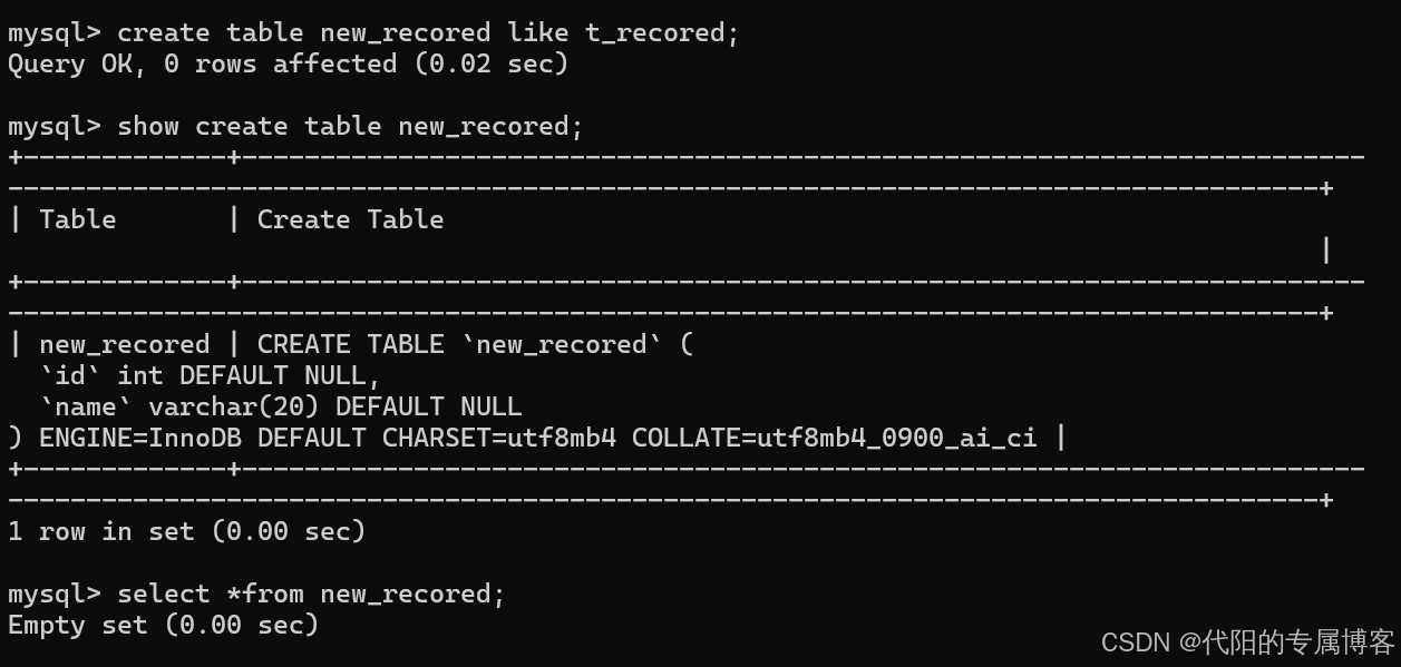 create table new_table like old_table可以创建一个相同的表结构的新表; 数据不会导入。