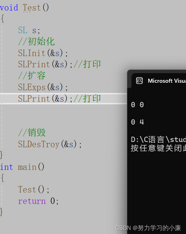 在使用完顺序表后,就要销毁顺序表,因为动态顺序表内存是动态开辟的,所以需要对动态内存进行释放,并将有效数据和空间容量个数置为0;