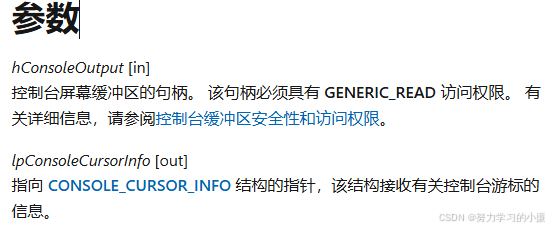 这里就用到上面GetStdHandle函数获得的句柄了,还需要用到CONSOLE_CURSOR_INFO结构体(注意,这里第二个参数是指针)