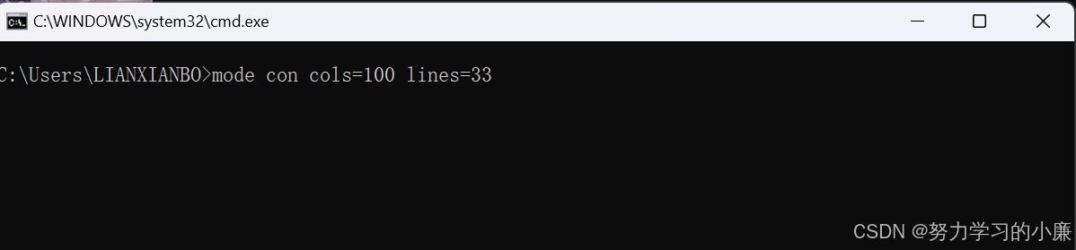 这里我们控制台程序是默认大小,这里我们自己设置控制台程序大小,这里使用cmd控制台程序设置窗口的大小(设置大小为行33,列100)