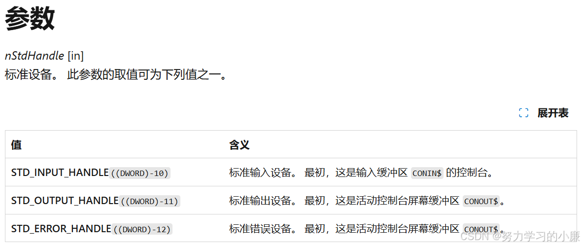 HANDLE WINAPI GetStdHandle(_In_ DWORD nStdHandle);函数参数