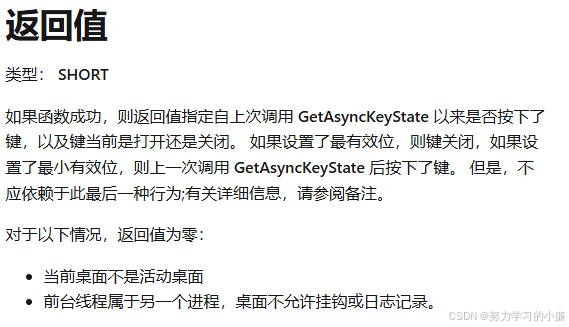 GetAsyncKeyState 函数返回值是short类型,在上一次调用 GetAsyncKeyState 函数后,如果返回的16位的short数据中,如果最高位是1,说明按键的状态是按下,如果最高位是0,说明按键的状态是抬起;如果最低位被置为1则说明,该按键被按过,否则为0。