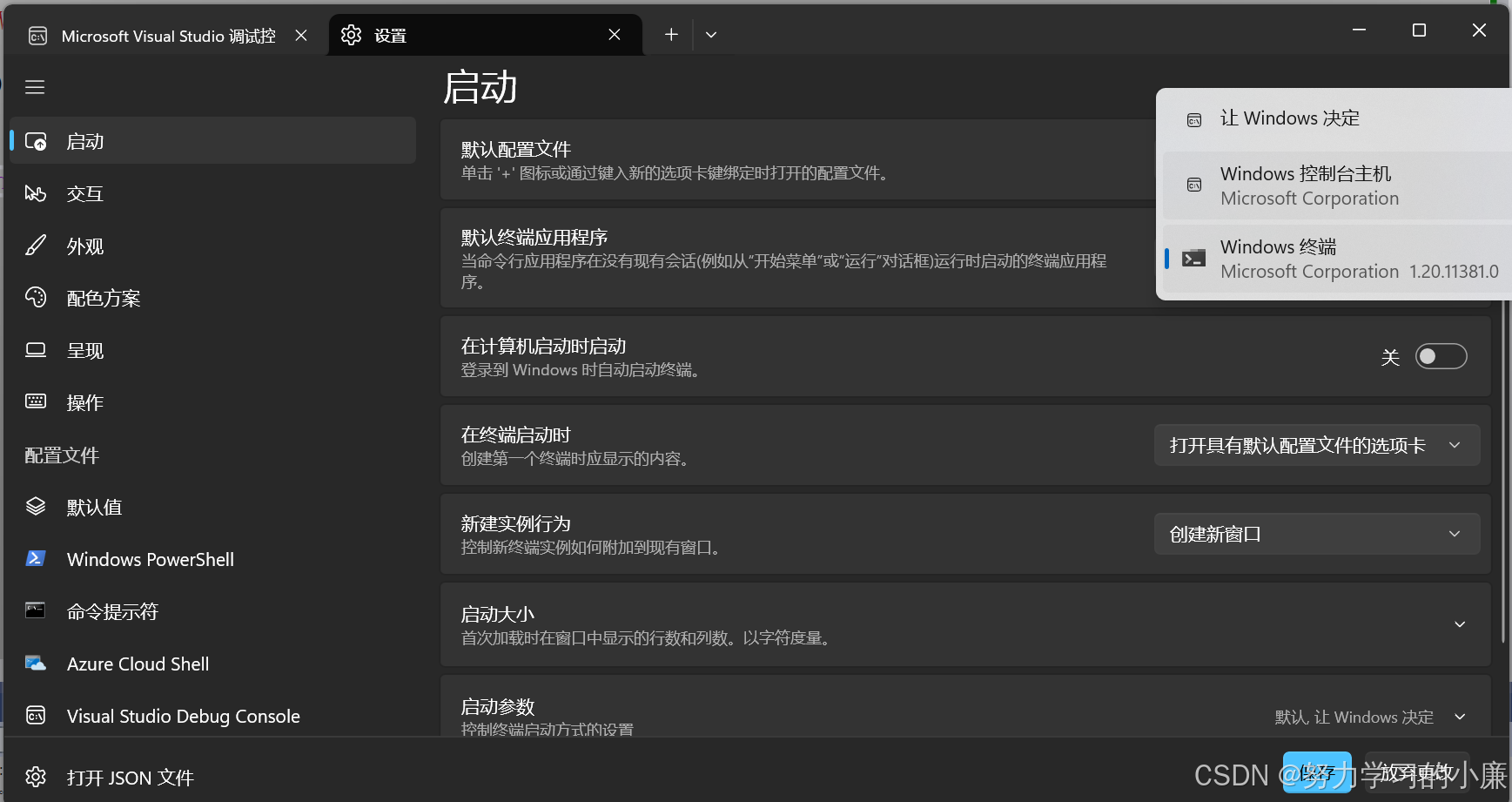 在默认终端应用程序这里设置成Windows 控制台主机(默认是Windows 终端),点击保存