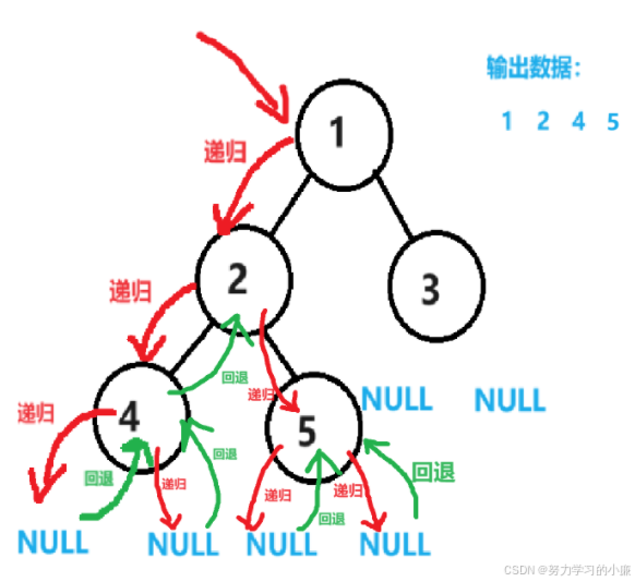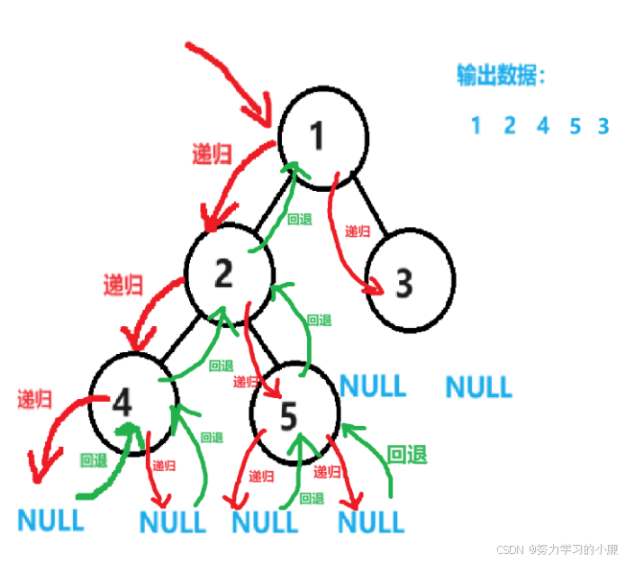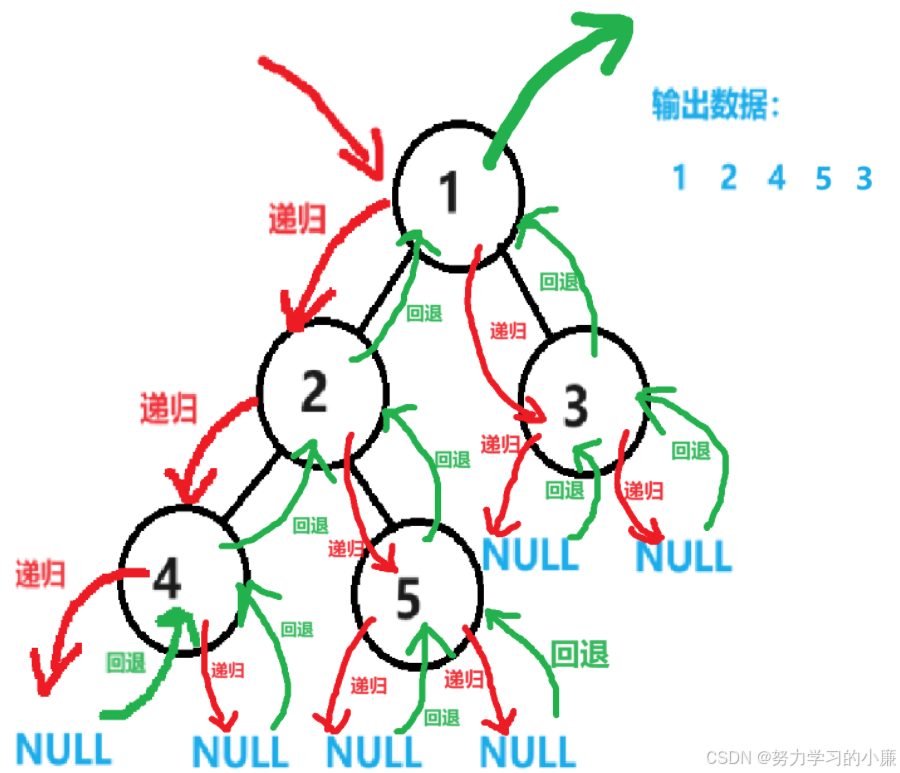 这里节点5的左右节点都为空,这里省略一些过程;此时5这个节点访问结束,回退到2这个节点,而2这个节点右子树访问结束,也已经访问结束了;此时再回退到根节点,访问根节点的右子树。