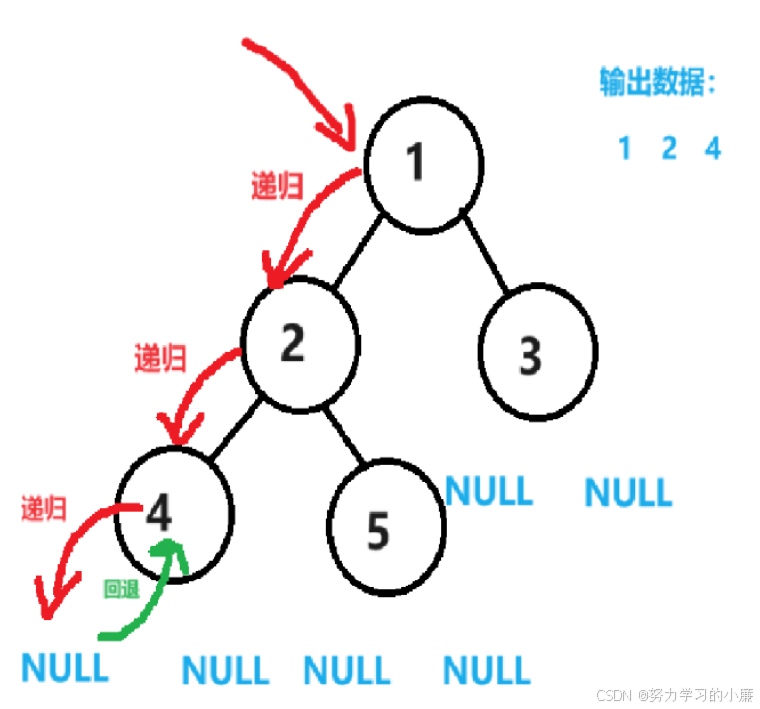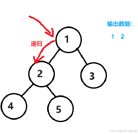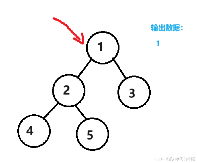 首先访问根节点,输出访问到的数据 1 ;再访问左子树
