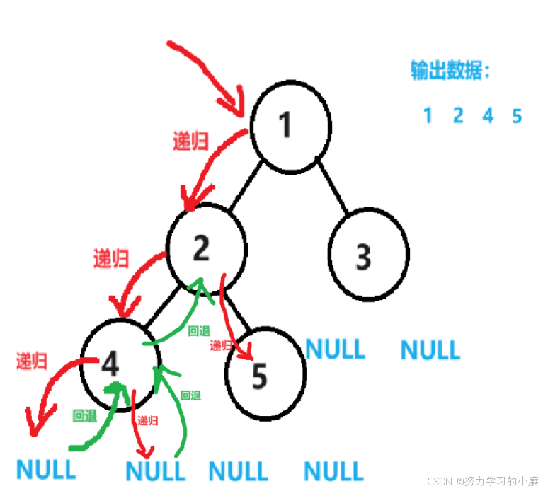 访问2这个节点的右子树,先输出右子树的根节点数据 5 ;再访问根节点5的左子树