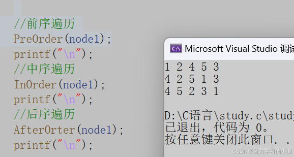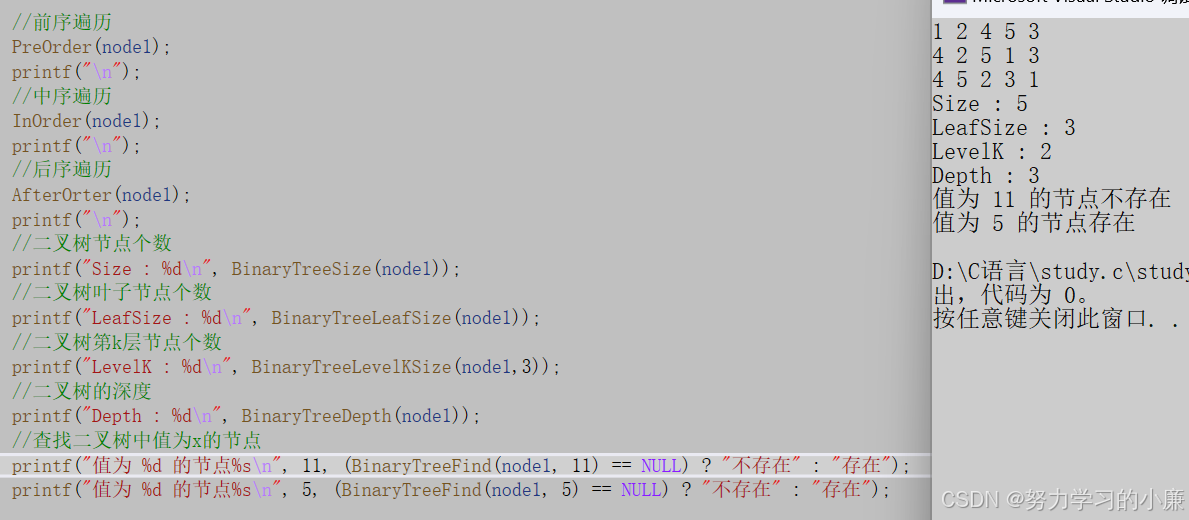 }这里为了测试这些代码,就手动创建了一个二叉树,这些都是动态开辟的空间,养成好习惯,手动释放动态开辟的空间。