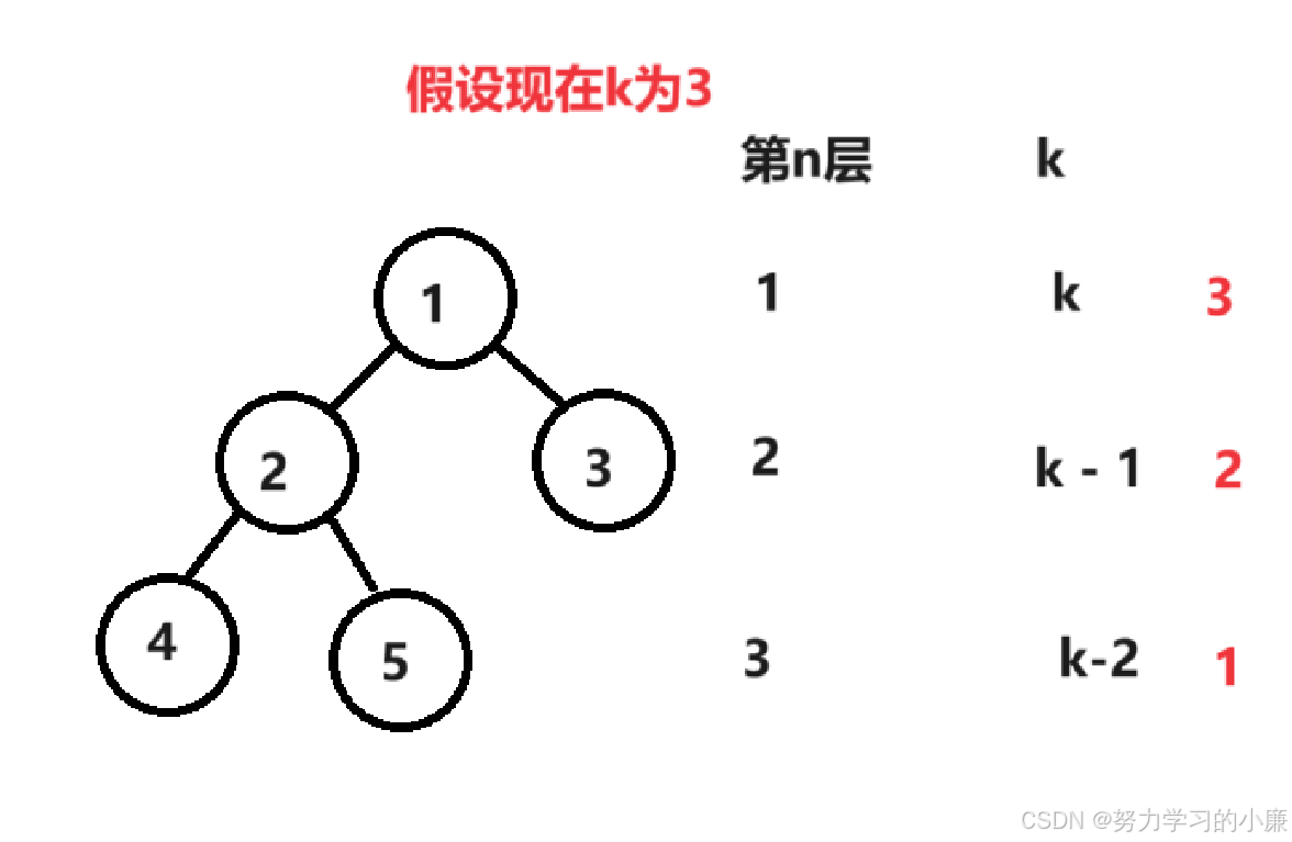 通过图我们可以看到,每次向下遍历一层,k-1;当k=1时,正好是第k层