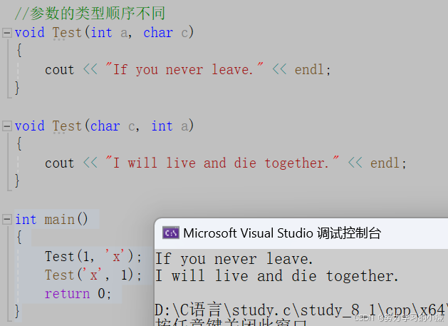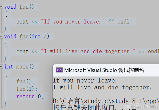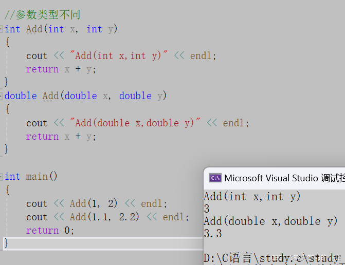 C++支持在同一作用域中出现同名函数,但是要求这些函数的形参不同,可以是参数个数不同或者参数类型不同;这样C++函数调用就表现了多态行为,使用更加灵活。(C语言是不支持同一作用域中出现同名函数的)