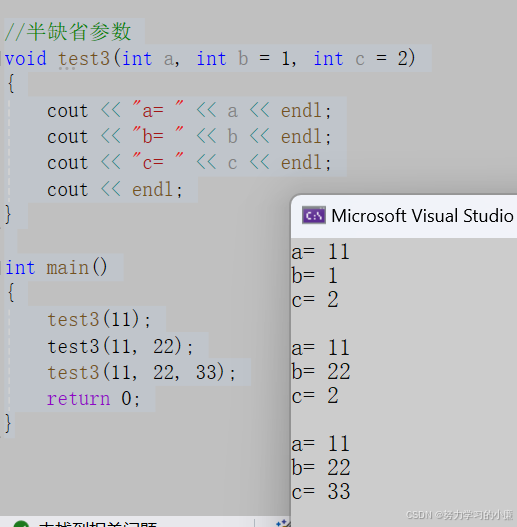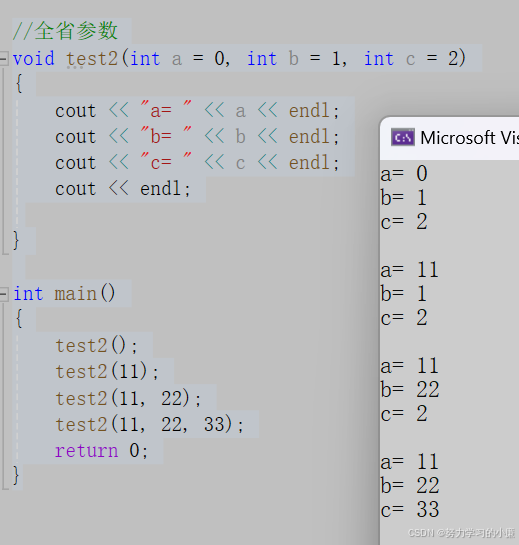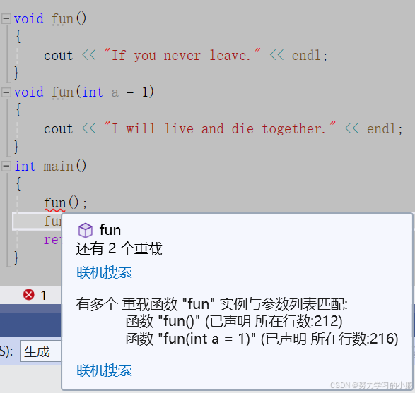 这里有一个需要注意的点,如果只有参数,而且给了缺省参数,(如果这是还有一个与其命名相同的函数(没有参数),调用时就会报错)