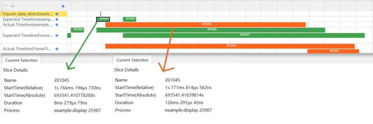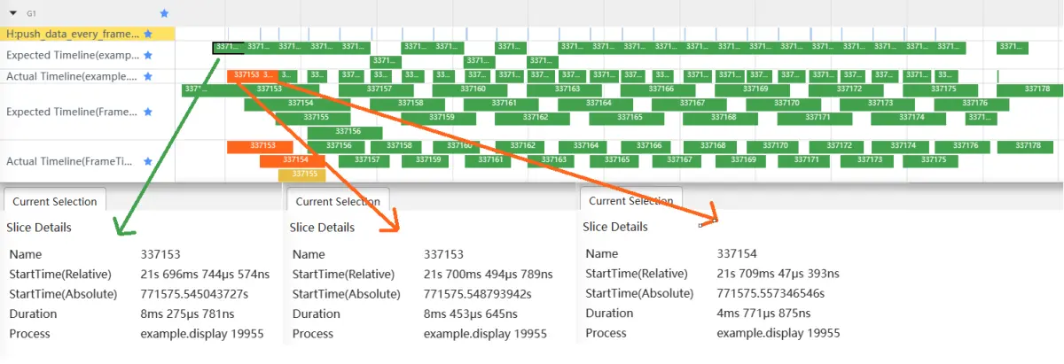 从图中可以看到,除了第1帧和第2帧有所延迟,其他的帧都没有问题。其中,第1帧实际耗时比期望耗时多158μs左右,时间上的影响很小;通过push_data_every_frame_half_month标签可以看到,第1帧运行到一半时才开始加载数据,导致了第2帧的结束时间比预期要晚一点,实际上第2帧的绘制时间只有不到5ms,对性能的影响也很小。
