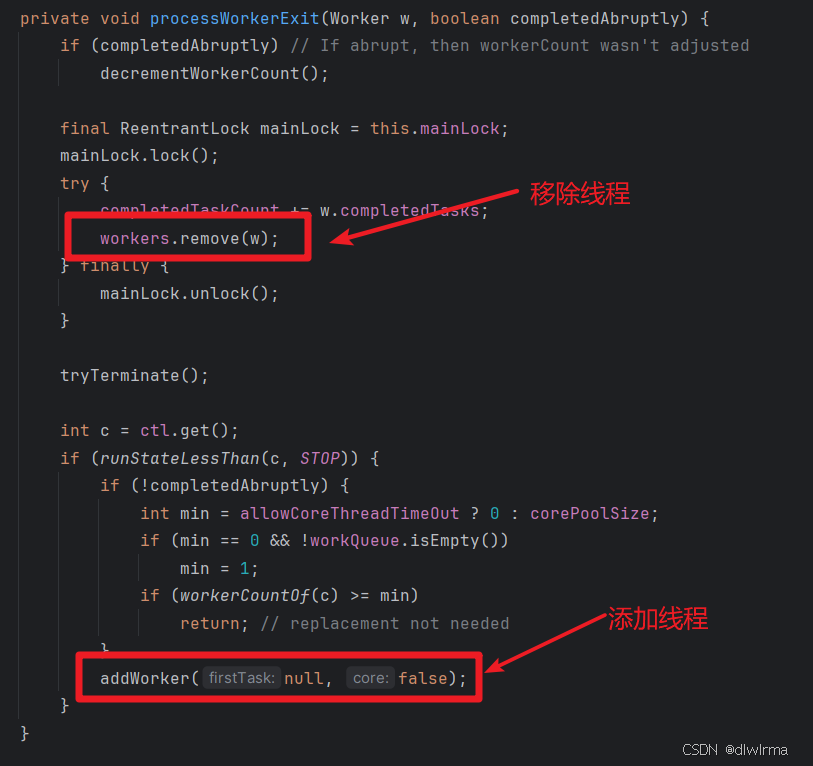 }在这段源码中我们看到了线程被复用的原因了,就是这个while的循环,当有任务需要执行或者能够从任务队列中获取到任务时,工作线程就会持续运行;如果从 getTask 获取不到方法的话,就会调用 finally 中的 processWorkerExit 方法,将线程退出。
