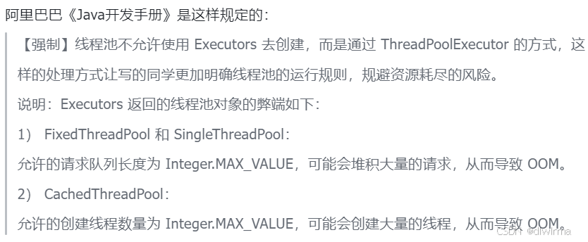 如果大家跟入到Executors这些方法的底层实现中去看一眼的话,立马就知道原因了,像FixedThreadPool 和 SingleThreadExecutor这两个方法内使用的是无界的 LinkedBlockingQueue存储任务,任务队列最大长度为 Integer.MAX_VALUE,这样可能会堆积大量的请求,从而导致 OOM。 而CachedThreadPool使用的是同步队列 SynchronousQueue, 允许创建的线程数量也为 Integer.MAX_VALUE ,如果任务数量过多且执行速度较慢,可能会创建大量的线程,从而导致 OOM,其他的方法所提供的均是这种无界任务队列,在高并发场景下导致OOM的风险很大,故大部分的公司已经不建议采用Executors提供的方法创建线程池了。
