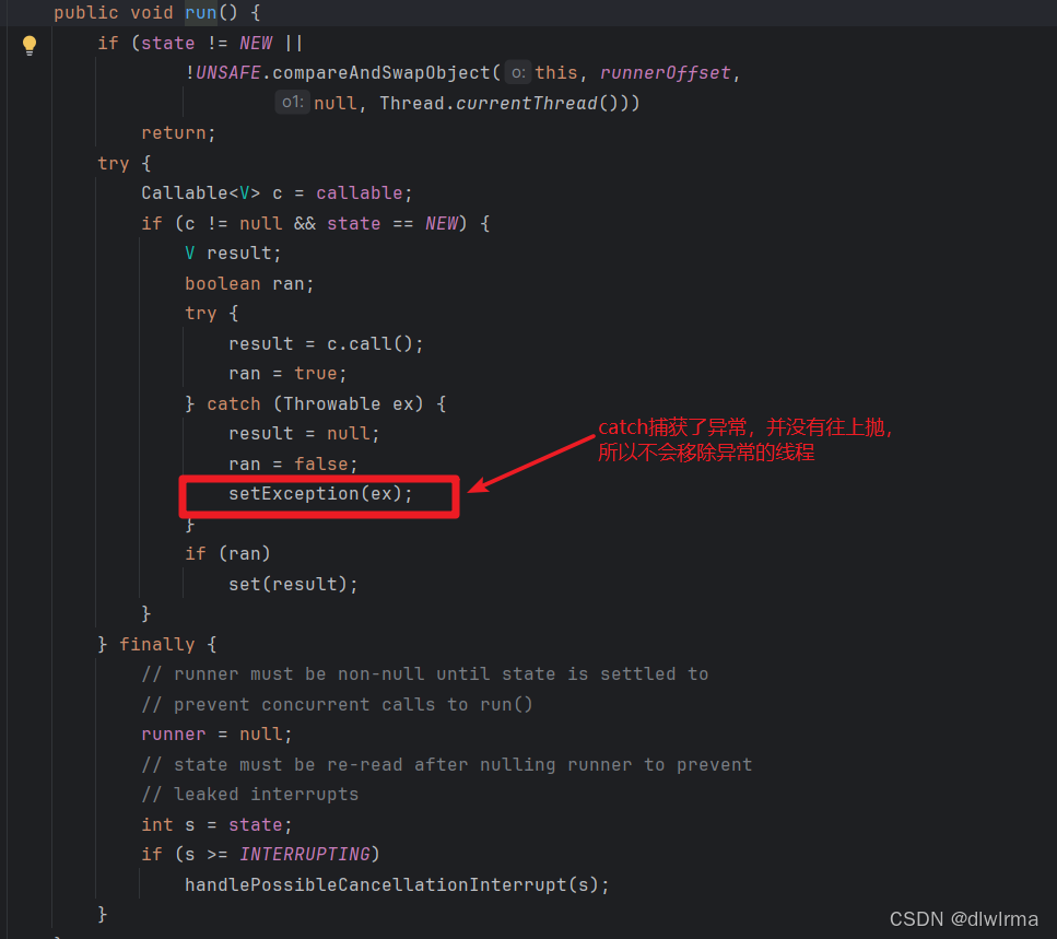 }execute方法会抛出异常终止线程的,为什么submit中不会呢,那么肯定在RunnableFuture里,经过一顿跟踪发现,这个Future中实现的run方法,对异常进行了捕获,所以并不会往上抛出,也就不会移除异常线程以及新建线程了。