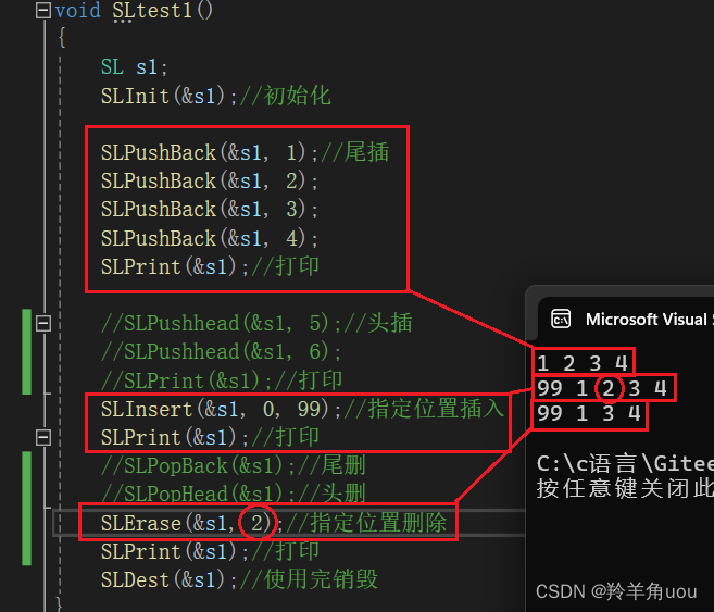 void SLErase(SL* ps, int pos);//指定位置删除第一个参数是顺序表,第二个参数是插入的下标的位置,pos不能是任意的,要大于等于0,小于size,这里不能等于size
