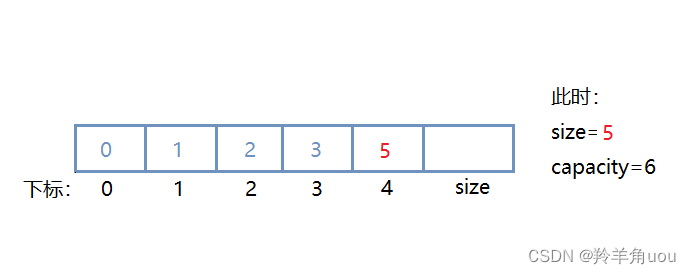 我们要尾插一个5,就插在下标为size的位置,此时size要+1