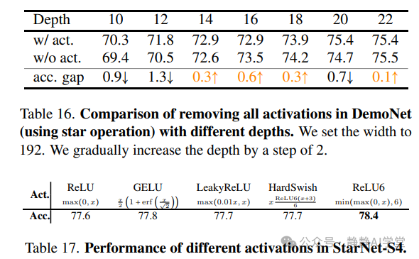 在大多数情况下,我们观察到从DemoNet(使用星操作)中移除所有激活函数后,性能略有下降。然而,出现了一个有趣的现象:在某些情况下,移除所有激活函数后,性能相似甚至更好。当深度值设置为14、16、18和22时,这一点尤为明显,如表16所示。这一现象表明,星操作可能本身就提供了足够的非线性,类似于通常通过激活层实现的效果。我们认为,对这一方向进行更彻底的研究可能会产生有价值的见解。