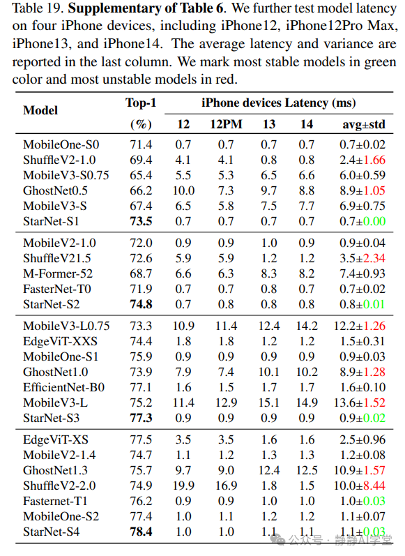 移动设备延迟鲁棒性。在表6中,我们展示了在iPhone13手机上测试的移动设备延迟。为了测试不同模型的延迟稳定性,我们进一步在4种不同的移动设备上进行了延迟测试,包括iPhone12、iPhone12 Pro Max、iPhone 13和iPhone14。表19中的结果显示,尽管某些模型的延迟结果有所不同,但StarNet在不同手机上的推理始终表现出稳定性,这归因于其简单的设计。
