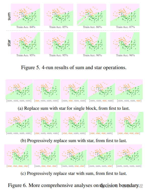 接下来,我们的研究扩展到了对决策边界的深入分析。考虑到网络有4个块,我们尝试将求和与星操作混合使用,以图6所示的各种组合方式进行应用。这一探索的视觉结果表明,在网络早期块中使用星操作能带来最显著的好处。