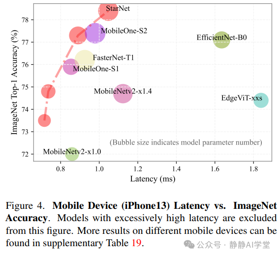 我们遵循DeiT[53]的标准训练配方来确保在训练我们的StarNet模型时进行公平比较。所有模型都从头开始训练300个周期,使用AdamW优化器[39],初始学习率为,批量大小为2048。详细的训练细节在补充材料中提供。为了基准测试的目的,我们将我们的PyTorch模型转换为ONNX格式[13],以便于在CPU(Intel Xeon CPU E5-2680 v4 @ 2.40GHz)和GPU(P100)上进行延迟评估。此外,我们使用CoreML-Tools[1]在iPhone 13上部署模型,以评估移动设备上的延迟。这些基准测试的详细设置也在补充材料中提供。