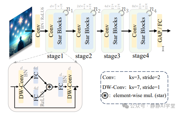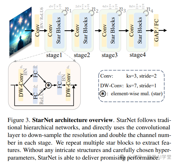 虽然许多高级设计技术(如重新参数化、结合注意力机制、SE块等)在经验上可以增强性能,但它们也会掩盖我们的贡献。通过有意避开这些复杂的设计元素并尽量减少人为设计干预,我们强调了星操作在StarNet概念化和功能中的核心作用。