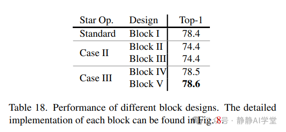 我们已经对StarNet块的设计进行了详细的消融研究。为此,我们探索了StarNet中星操作的五种不同实现方式,如图8所示。值得注意的是,Block I代表了星操作的标准实现。Block II和Block III是3.3节中讨论的特殊情况II的实例化,而Block IV和Block V则提供了特殊情况III的另一种实现方式。所有这些块变体都通过调整扩展比率来保持相同的参数数量和浮点运算次数(FLOPs),以确保在公平比较下具有相同的计算复杂度。这些块变体在StarNet-S4架构框架中进行了测试,其性能在表18中详细列出。经验上,Block I、Block IV和Block V表现出了强大的性能,并且性能差距很小。这些发现表明,其有效性更多地归因于星操作本身,而不是特定块的设计。因此,我们将默认的星操作(Block I)作为我们StarNet中的基础构建块。