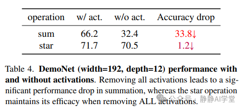 在本研究中,尽管我们主要关注通过星操作实现的隐式高维特征,但非线性的方面也具有重要意义。为了研究这一点,我们通过从DemoNet中移除所有激活函数来进行实验,从而创建了一个无激活函数的网络。表4中的结果非常鼓舞人心。正如预期的那样,在移除所有激活函数后,求和操作的性能显著下降,从下降到。相比之下,星操作在消除激活函数后仅受到极小的影响,准确率仅下降了。这一实验不仅证实了我们的理论分析,还为未来的研究开辟了广阔的道路。