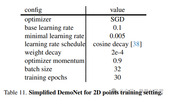 DemoNet用于2D点 鉴于2D点的固有简单性,我们消除了所有数据增强过程,并减少了训练周期数。这个简化流程的具体训练方案详见表11。