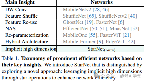 高效网络。高效网络致力于在计算复杂性和性能之间找到理想的平衡。近年来,为了增强网络的效率,引入了许多创新的概念。这些概念包括深度卷积[28, 46]、特征重用[6,19]和重参数化[55]等。表1中提供了一个全面的总结。与所有先前的方法形成鲜明对比的是,我们展示了星操作可以作为高效网络的一种新颖方法。它具有独特的能力,可以在低维空间中执行计算时隐式地考虑极高维特征。这一显著优点使得星操作在高效网络领域中与其他技术区别开来,并使其特别适合用于高效网络设计。通过星操作,我们展示了一个简单的网络可以轻松地超越经过精心设计的复杂网络。