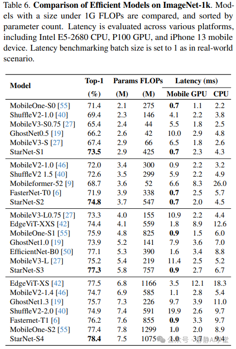 表6中列出的所有模型都已从PyTorch代码转换为ONNX格式[13],以便在不同硬件上进行延迟评估:CPU(Intel Xeon CPU E5 2680 v4 @ 2.40 GHz)和GPU(P100)。我们进行了基准测试,其中批次大小为1,以模拟真实世界的应用场景。基准测试包括50次迭代的预热阶段,随后计算500次迭代的平均延迟。重要的是要注意,所有模型都在同一设备上进行了基准测试,以确保比较的公平性。对于CPU基准测试,我们利用4个线程来优化性能。在GPU评估的情况下,我们将StarNet中的逐点卷积层适应为线性层,并加入了置换操作。这一修改是基于观察到稍微更快的推理速度而做出的。重要的是要注意,从数学上讲,逐点卷积层等价于线性层。因此,这一变化不会导致我们StarNet的性能差异或架构变动。