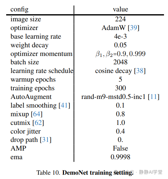 DemoNet 对于所有DemoNet变体,我们使用了一致且标准的训练方案。尽管公认的是,专门化和精细调整的训练方案可能更适合不同模型大小,并可能产生更好的性能,如在DemoNet(宽度=96,深度=12)(大约1.26M参数)和DemoNet(宽度=288,深度=12)(大约9.68M参数)的情况下,但使用DemoNet获得卓越性能并不是本工作的主要目标。我们的目标是在各种DemoNet变体之间提供公平的比较;因此,相同的训练方案应用于所有变体。DemoNet的这种训练方案的详细信息如表10所示。