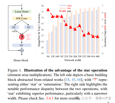 最近,一种新的学习范式逐渐受到越来越多的关注:通过元素级乘法融合不同子空间特征。为了简化表述,我们将其称为“星操作”(由于元素级乘法符号类似于星星)。星操作在多个研究领域中都展现出了出色的性能和效率,包括自然语言处理(如Monarch Mixer[16]、Mamba[17]、Hyena Hierarchy[44]、GLU[48]等)、计算机视觉(如FocalNet[60]、HorNet[45]、VAN[18]等)以及其他领域。为了说明这一点,我们为图像分类构建了一个“演示块”,如图1左侧所示。通过在主干层之后堆叠多个演示块,我们构建了一个简单的模型,名为DemoNet。在保持其他所有因素不变的情况下,我们观察到元素级乘法(星操作)在性能上始终优于求和操作,如图1右侧所示。