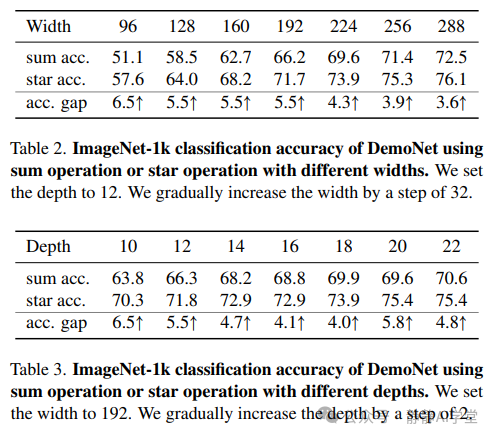 从表2和表3中,我们可以看到无论网络的深度和宽度如何,星操作始终优于求和操作。这一现象验证了星操作的有效性和优越性。此外,我们还观察到随着网络宽度的增加,星操作带来的性能提升逐渐减小。然而,在改变深度的情况下,我们并没有观察到类似的现象。这种行为的差异提供了两个关键的见解:1) 表2中星操作带来的增益逐渐减小并不是因为模型尺寸增大所致;2) 基于此,它暗示星操作本质上扩展了网络的维度,从而减少了增加网络宽度所带来的额外益处。