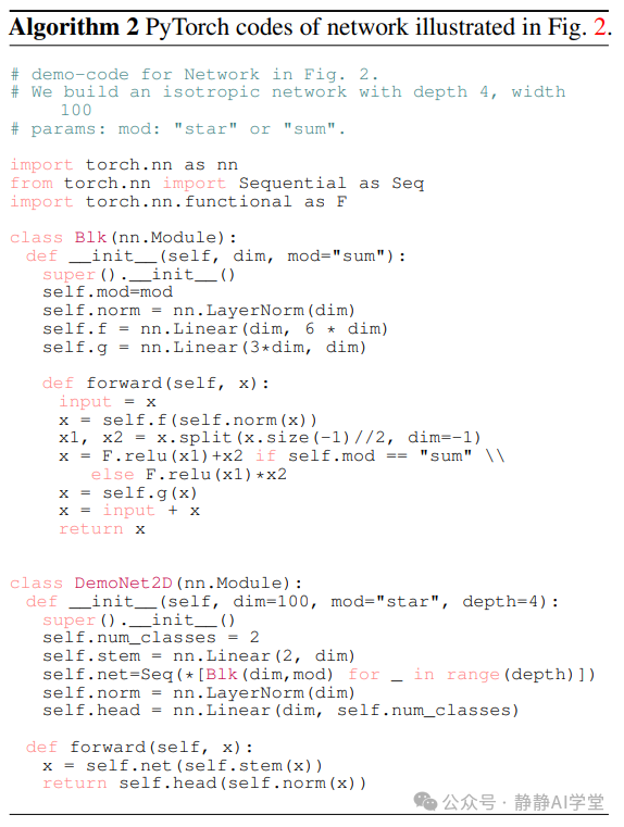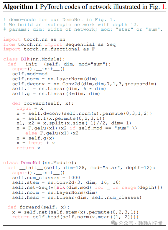 首先,我们通过实证验证了星操作相对于简单求和操作的优越性。如图1所示,我们为此演示构建了一个同构网络,称为DemoNet。DemoNet设计简单,由一个卷积层开始,该层将输入分辨率降低了16倍,随后是一系列同质的演示块(demo blocks)用于特征提取(参考图1左侧)。在每个演示块内,我们应用星操作或求和操作来融合来自两个不同分支的特征。通过改变网络的宽度和深度,我们探索了每种操作的独特属性。DemoNet的实现细节在补充算法1中提供。