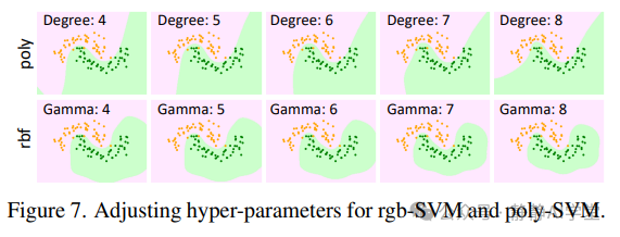SVM中超参数的影响。应该注意的是,参数调整会导致不同的可视化结果,这可能会对我们的基于图2的论点构成挑战。然而,由于ploy和rbf核之间的内在差异,这种变化并不显著,如图7所示。我们基于星的网络决策边界始终与poly-SVM的决策边界相似。因此,不仅有理论证明,我们的视觉实验也坚如磐石。