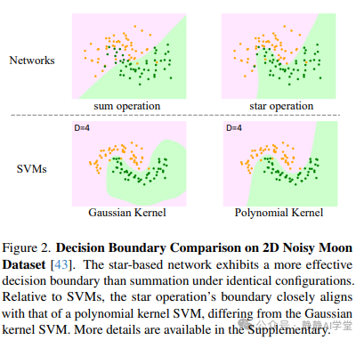 图2(上排)展示了由求和操作和星操作所确定的决策边界。显然,星操作划定了一个相比求和操作更加精确和有效的决策边界。值得注意的是,观察到的决策边界之间的差异并非源于非线性,因为这两种操作都在其各自的构建块中包含了激活函数。主要的区别在于星操作能够达到极高的维度,这是我们之前详细分析过的特性。