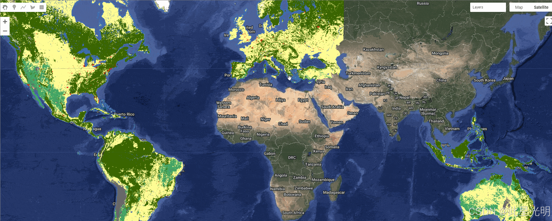 目前的数据集包括美洲、欧洲和大洋洲的数据,非洲和亚洲的数据将于 2025 年初发布。 非洲和亚洲的数据将于 2025 年初发布。 土地覆被质量保证层将在下一个地图版本(如 v1.1)中提供。 谷歌地球引擎数据集使用不同的平铺系统,旨在简化平台并提高效率,并使用 1984 年世界大地坐标系(EPSG:4326)存储,与用于生成数据集的基础 CCDC 数据集相匹配。 相比之下,LP-DAAC 中存储的数据集是从 GEE 中导出的,使用的是基于大陆网格(150 x 150 平方公里)和投影(大陆兰伯特方位角等面积投影)的定制平铺系统。