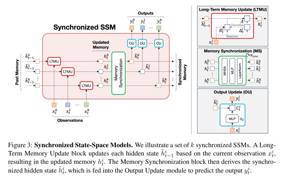同步选择性状态空间模型。 令表示来自一组序列中的第个输入序列在时间的离散观测值。作者选择选择性状态空间模型(Gu & Dao,2023)来通过一个隐藏状态(等式(3a))来建模每个序列,但作者的方法适用于任何其他状态空间模型。给定记忆,作者定义一个长期记忆更新(LTMU)函数,该函数根据当前观测值更新,从而得到更新的记忆。作者提出一个记忆同步(MS)函数,该函数根据一组同步隐藏状态来生成个序列之间的交互(等式(3b))。