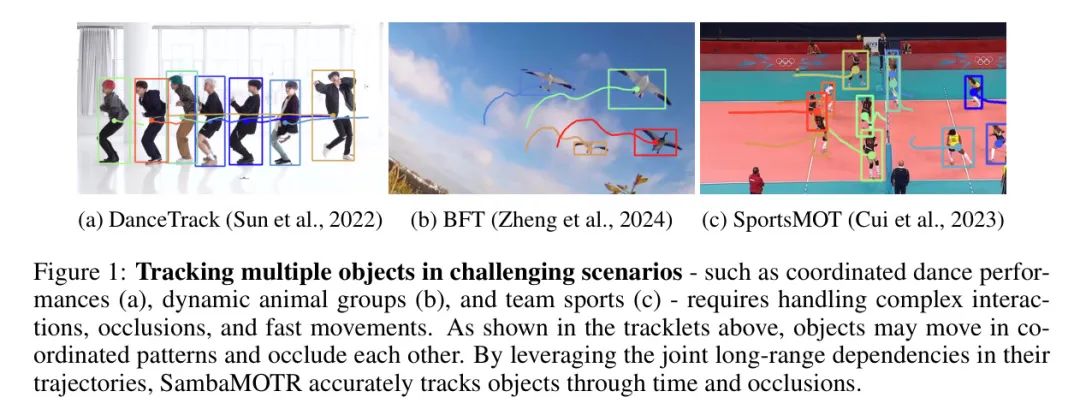 数据集 为了评估SambaMOTR,作者选择了具有高度非线性运动、频繁遮挡和统一外观的多种具有挑战性的数据集。所有数据集都包含物体同步运动的情景。因此,它们是评估跟踪粒度交互重要性的合适基准。DanceTrack(Sun等人,2022)是一个由100个多人舞蹈视频组成的多人跟踪数据集。Bird Flock Tracking(Zheng等人,2024)数据集包括来自BBC纪录片系列Earth-flight(Downer & Tennant,2011)的106个片段。SportsMOT(Cui等人,2023)包含来自篮球、排球和足球场景的240个视频序列。