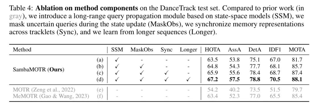 作者的最终 Query 传播方法(第d行)将MeMOTR的关联准确性提高了5.2%(第f行),并将MOTR的提高了惊人的17.3%(第e行)。