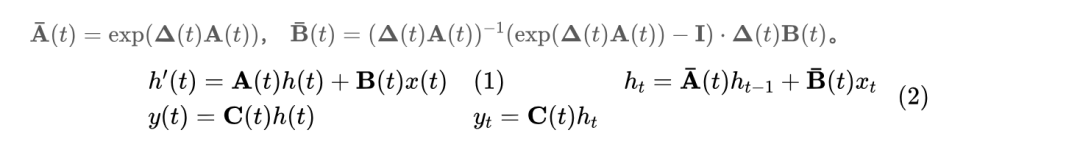 作者正式定义选择性SSMs(S6)(Gu和Dao,2023)。令表示时间的输入信号,表示隐藏状态,表示输出信号。给定系统,控制和输出矩阵,作者定义如方程(1)所示的连续线性时变SSM。通过离散化规则,可以得到定义的SSM的离散时间等效系统(方程(2))。