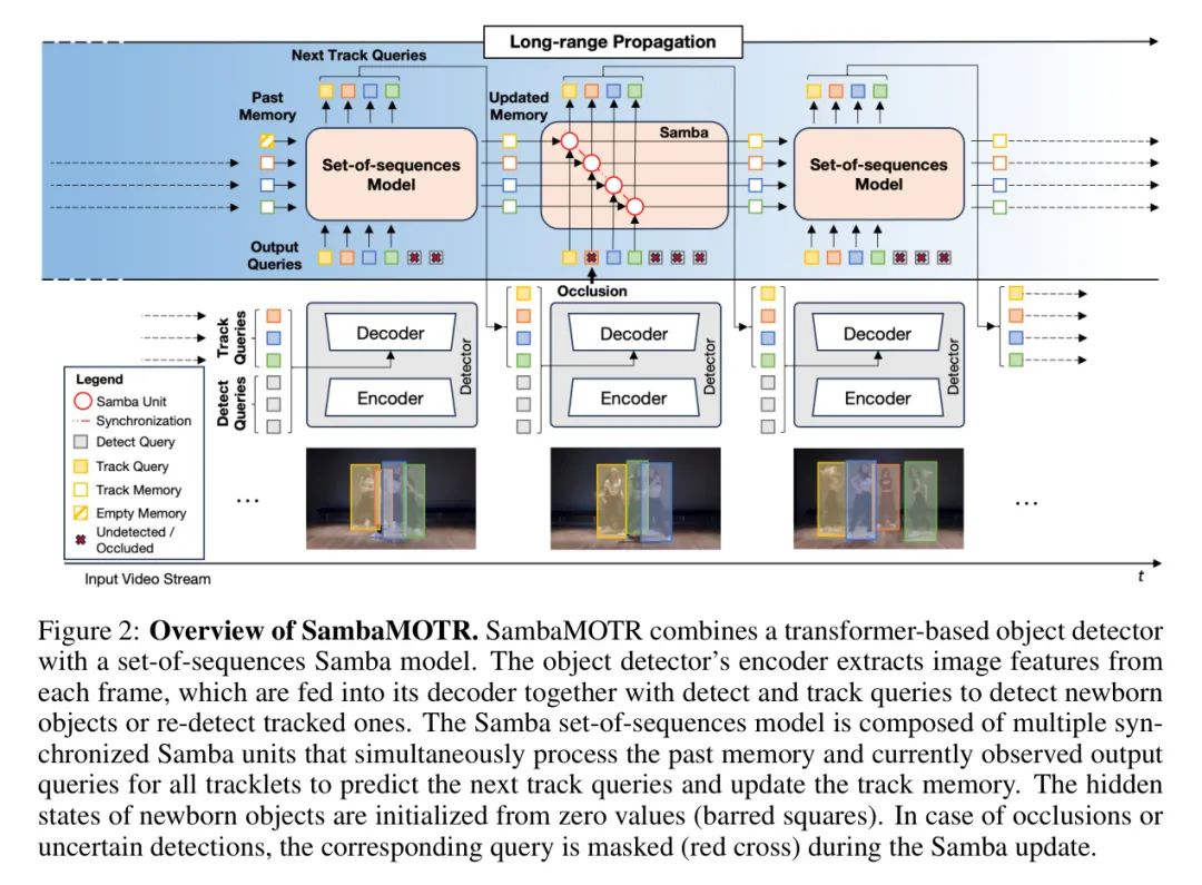 复杂场景下的多目标跟踪(如协调舞蹈表演、团队体育或动态动物群)面临着独特的挑战。在这些场景中,物体经常以协调的模式移动,互相遮挡,并在其轨迹中表现出长期依赖性。 然而,如何在每个跟踪片段内建模长程依赖性,以及跟踪片段之间的相互依赖性和相关的时间遮挡仍是一个关键的开放性研究问题。 为此,作者提出了Samba,这是一个旨在通过同步用于每个跟踪片段的多个选择状态空间来联合处理多个跟踪片段的新颖线性时间序列模型。Samba自回归地预测每个序列的未来跟踪 Query ,同时保持跟踪片段之间的同步长期记忆表示。 通过将Samba集成到跟踪传播框架中,作者提出SambaMOTR,这是第一个有效解决上述问题的跟踪器,包括长程依赖性、跟踪片段之间的相互依赖性和时间遮挡。 此外,作者引入了一种有效的处理不确定观测(MaskObs)的技术和一种高效的训练配方,以将SambaMOTR扩展到更长的序列。 通过建模跟踪物体的长程依赖性和相互作用,SambaMOTR隐式地学习在没有任何手工设计启发式的情况下准确跟踪物体通过遮挡。 作者的方法在DanceTrack、BFT和SportsMOT数据集上显著超越了先前的最先进水平。