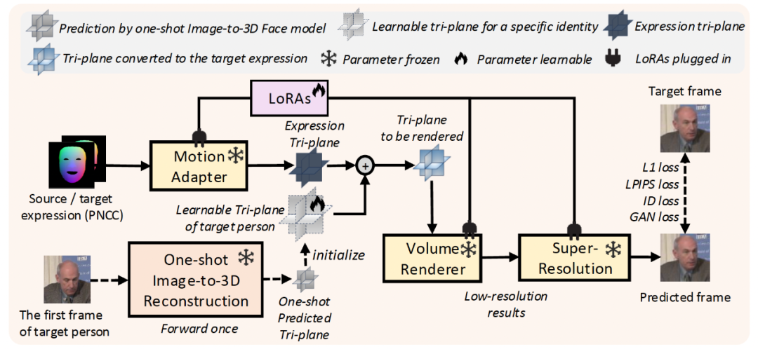 图 2. 将通用 3D 数字人大模型适应到单个目标人,动静结合的高效微调方案