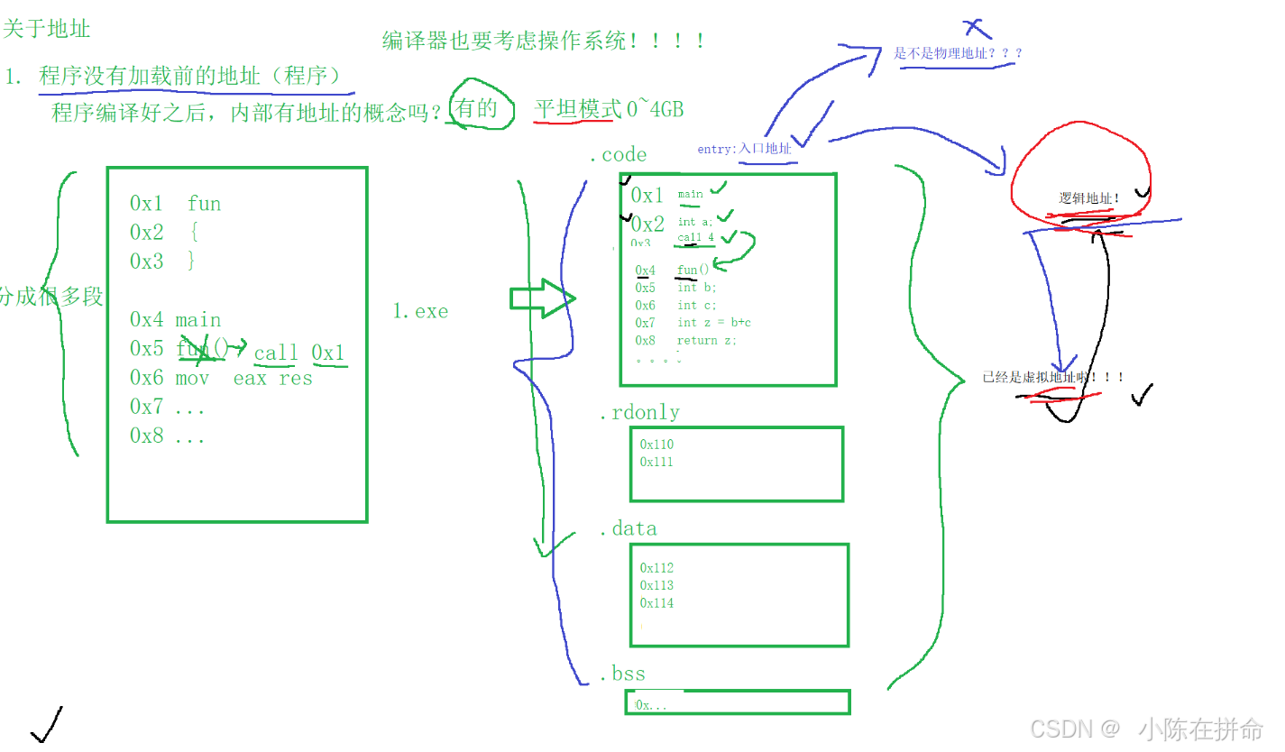 编译后的天然就给代码编址(逻辑地址)了(比如多态的虚函数表,call某个函数)——>说明此时编译器已经在帮操作系统考虑加载和执行的问题了!!