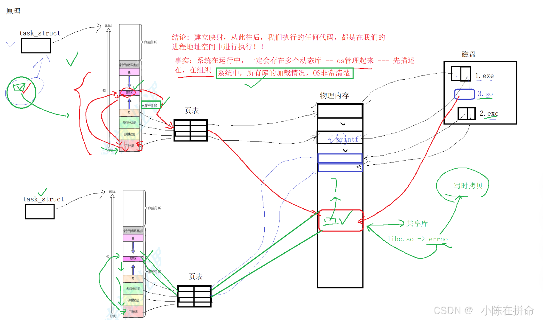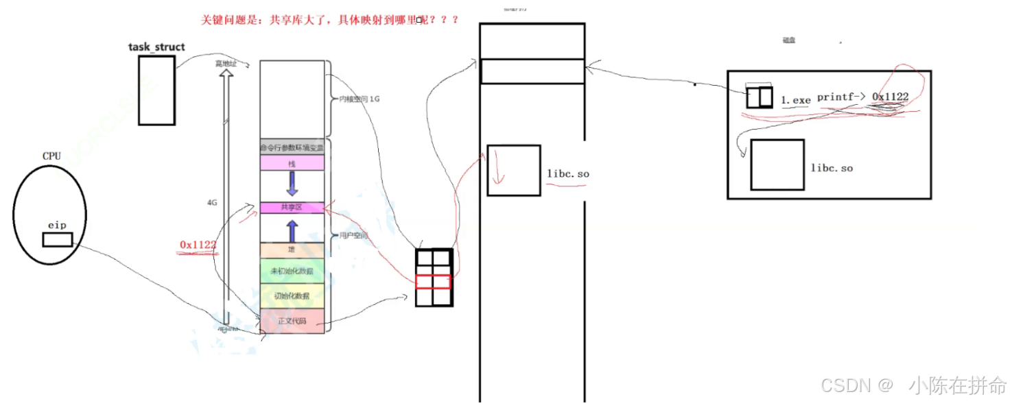 1、 当cpu执行代码正文部分的时候,当发现需要被调用的库函数,就会跳到共享区去查找,如果此时库文件还没有被加载进内存,就发生缺页中断,然后将动态库文件加载进来,建立和页表的映射关系,从此往后我们执行的任何代码,都是在我们的进程地址空间中进行!!