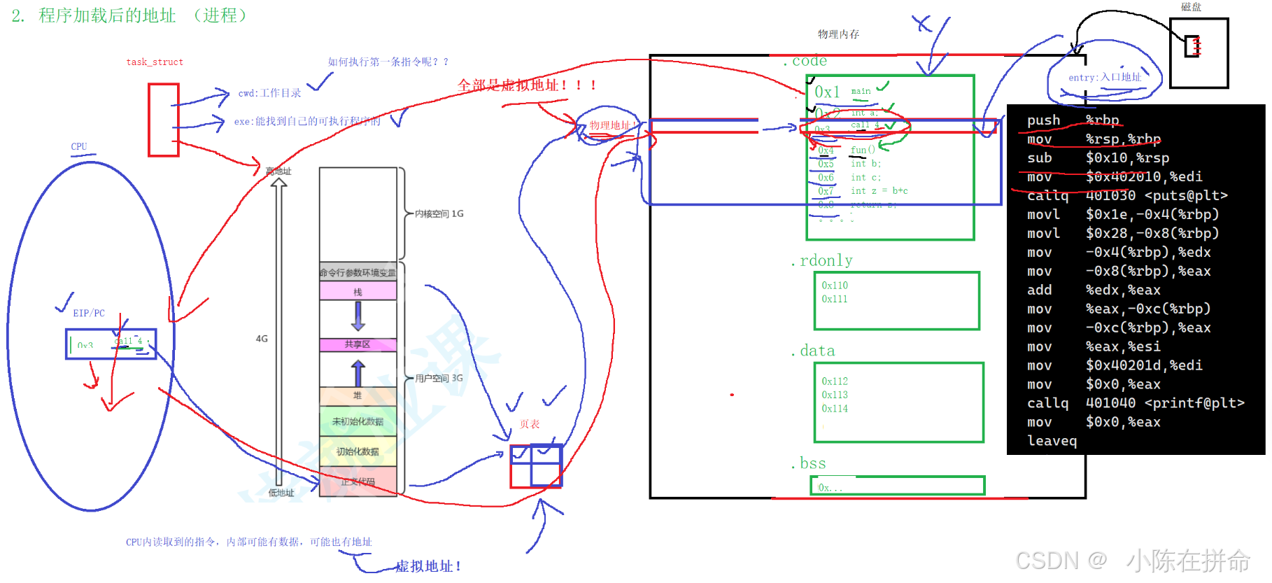 编译后的可执行程序有一个表,表头是入口地址(也是虚拟地址),cpu拿到入口地址后开始执行