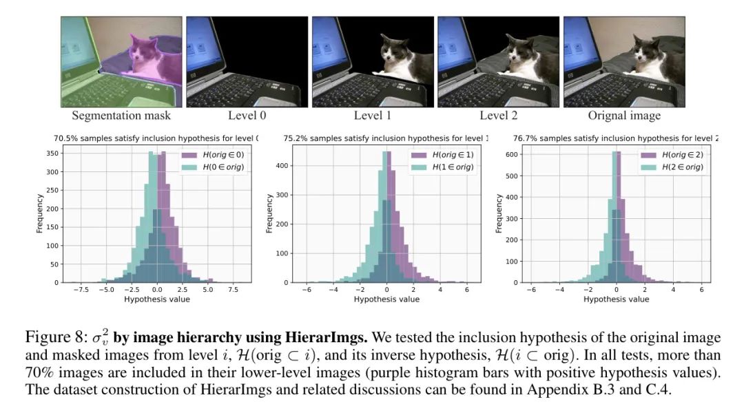 作者进一步研究是否视觉模态也出现类似现象,通过构建一个新的HierarchImgs数据集来表示逻辑视觉层次。如图8上 row 所示,作者的HierarchImgs数据集包括四个 Level :第4 Level 是原始图像,第0 Level 是最大的视觉分割。数据集构建的详细信息可以在附录B.3中找到。