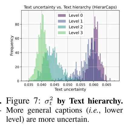 从这个观察中,作者探索了不确定性与不同描述 Level 之间的关系。作者使用了HierarCaps数据集,其图像具有从COCO Caption及其逻辑推论层次结构中包含的四种不同 Level 的描述(例如,“鸟”“蓝色鸟”...)。如图9所示。图7显示了文本不确定性与文本层次之间的关系。在这里,0表示最通用的描述,例如“椅子”或“鸟”,而4代表100OCO Caption的原始描述。如图所示,更通用的描述(较低的 Level )往往具有更大的不确定性,而更具体的描述(较高的 Level )往往具有较小的不确定性。