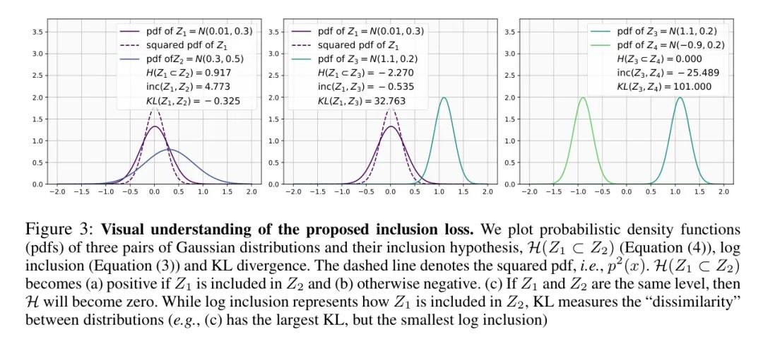 然而,作者衡量两个随机变量的“包含”程度,因此是非对称的:如果被包含在中,那么就不会被包含在中,即。与非对称度量(如KL散度)相比,作者旨在衡量是如何被包含在中的。相反,KL度量是基于相对熵它们之间的差异。如图3所示,即使和具有相同的方差,作者具有非常高的KL,而作者的度量变得非常小。