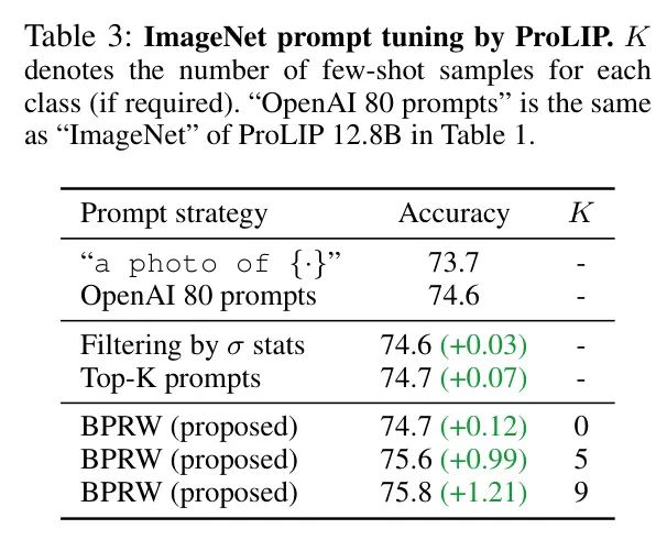不确定性驱动的ImageNet Prompt 增强。如第3.4节所述,作者提出了一种新的 Prompt 重权方法BPRW,用于为每个类别找到一个权重π_c。由π_c加权的一个文本嵌入,即 将作为ZSC的新类别嵌入。表3显示了不同策略下ImageNet分类结果。首先,仅使用文本不确定性和过滤掉不确定文本策略并不足够有效,它们仅提高了约+0.05pp top-1准确率。另一方面,BPRW通过使用额外的视觉信息实现了更好的准确率,作者在ImageNet ZSC上取得了+0.12pp的改进。